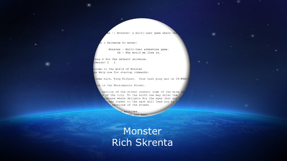 Created by Roy Trubshaw and Richard Bartle in 1978, it was the first of the text worlds: alternate realities simulated in computers, that hundreds of people could connect to at once.